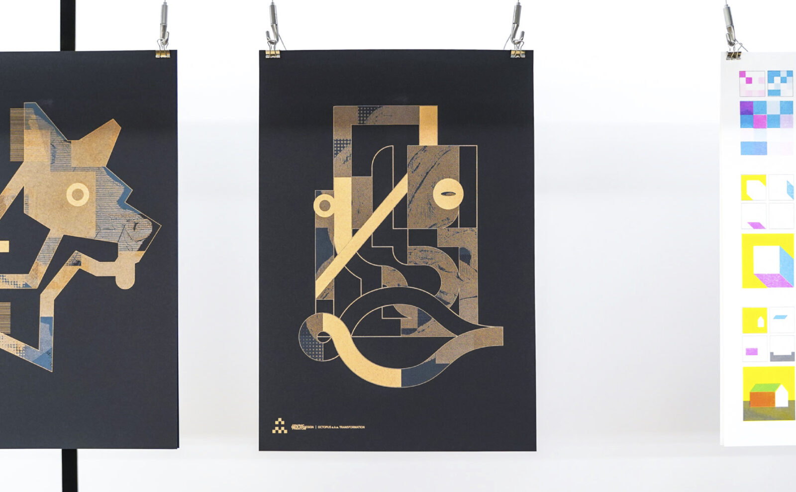 作品は先日のSTOCK MEMBER GALLERY 2022で発表したGRAPHIC PHANTOMよりチョイスした2点を、デジタル孔版印刷機「リソグラフ」を用いて印刷したものです。